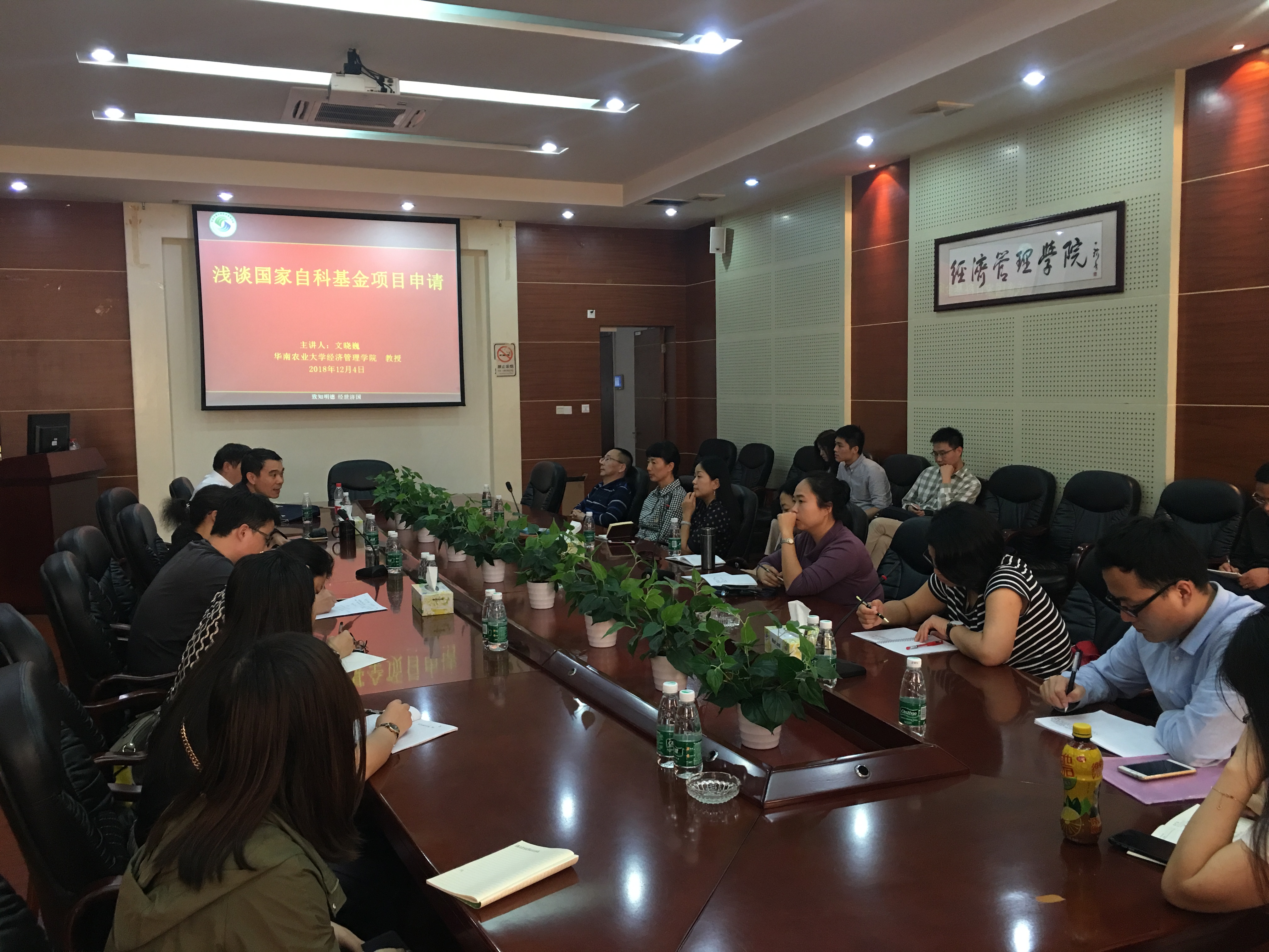 最后,想方设法帮助教师提高申报质量。一方面,学院利用一切可能的机会,邀请院内外专家通过多种方式指导老师做好申报选题润色及申报书的修改完善。另一方面,邀请院内外专家做申报辅导。12月4日,由学院分管副院长罗明忠教授主持,国家自然科学基金重点项目主持人文晓巍教授为师生做了“浅谈国家自然科学基金项目申请”的辅导报告。