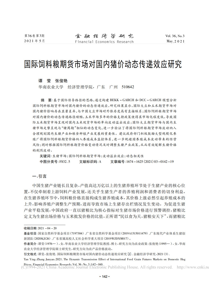 关键词 生猪市场;国际饲料粮期货市场;波动溢出效应;动态相关性