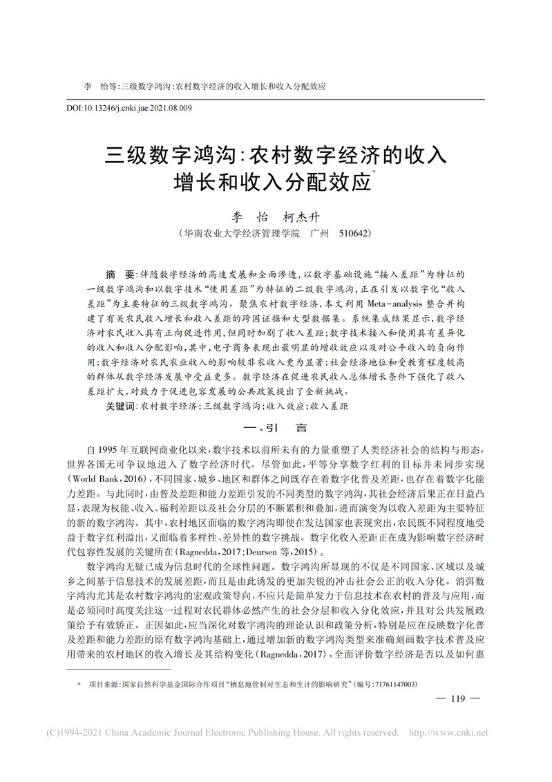 【科研论文推送】《农业技术经济》李怡等:三级数字鸿沟:农村数字经济的收入增长和收入分配效应