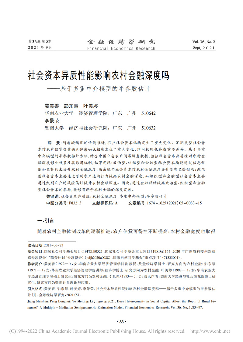 【科研论文推送】 《金融经济学研究》姜美善等:社会资本异质性能影响农村金融深度吗——基于多重中介模型的半参数估计