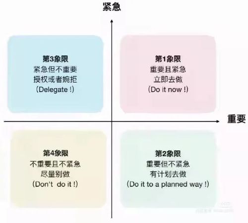 第一点,做到心中有标杆。人的精力有限,不同时间大家肯定是需要有不同侧重点的。设立目标,并根据目标有所侧重。由于我的目标是保研,我自己心中的一个标杆是:学习>工作、竞赛>社团活动。根据这个标杆与“四象限法则”,把手头上的学习与工作任务分成四类去执行(具体如图所示)。这是多项任务撞车时予以平衡的一种方法。
