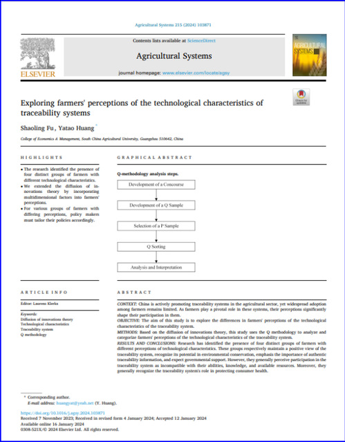 365官网符少玲教授与博士生黄雅涛在国际期刊Agricultural Systems发表论文 “Exploring farmers' perceptions of the technological characteristics of traceability systems”。