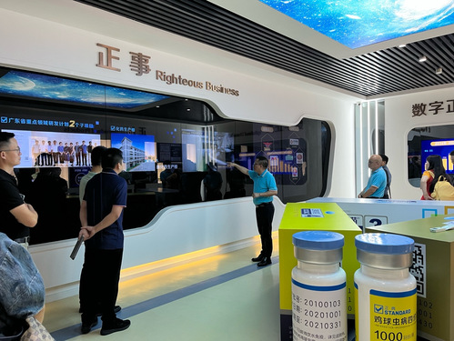 在副总经理符德文的带领与介绍下,华农MBA师生首先参观了正典的厂区及展厅,深入了解了公司的发展历程、核心业务、技术创新和行业成就。正典是全国首家获得动保GMP认证的生物技术企业,专注于畜牧防疫及肠道健康产品的研发和生产,秉持“正人、正事、正品”的核心理念,赢得了业内外的高度评价。正典公司中有相当一部分员工也来自华南农业大学,这种深厚的校企渊源为双方合作奠定了坚实的基础。