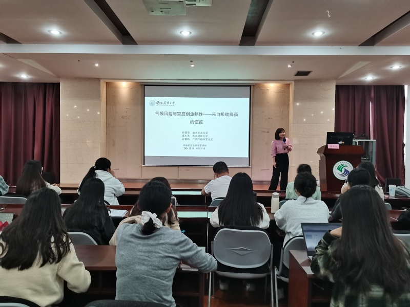 2024年11月19日下午,115周年校庆“学术华农”系列活动之0434暨紫荆学术论坛第245期学术报告在601会议室成功举办。此次论坛邀请南京农业大学金融学院的杰出学者郭萌萌教授,她以其深厚的学术造诣和独到的见解,深入浅出、剥丝抽茧,为大家带来了一场题为“气候风险与家庭创业韧性”的精彩报告。此次报告由大数据与数字经济中心主任陈有华教授主持,共有100余人参加了本次讲座,包括何勤英教授在内的多位老师及学院硕博研究生。