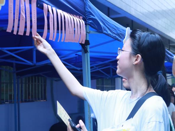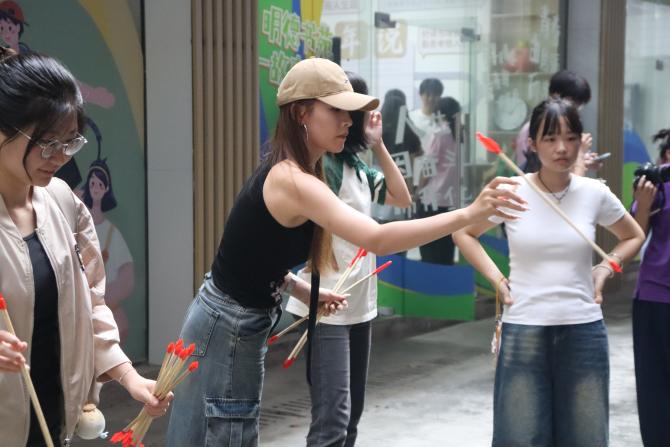同时,中秋游园会精心设计了游戏互动、文化体验、祈福留念三大板块,旨在通过寓教于乐的方式,让同学们在轻松愉快的氛围中感受传统文化的魅力。游戏互动区设置了玉兔投壶和巧手夹“月”等传统游戏,锻炼了同学们的动手能力和协作精神,更让大家在游戏中体验到了传统文化的乐趣。文化体验区墨香盈袖,玲珑花灯下悬着妙趣横生的灯谜,书签制作工坊内,师生共执丹青,将传统美学凝于方寸之间。祈福留念区特别设置了月下星愿打卡点,为同学们提供了记录美好时刻的活动空间。