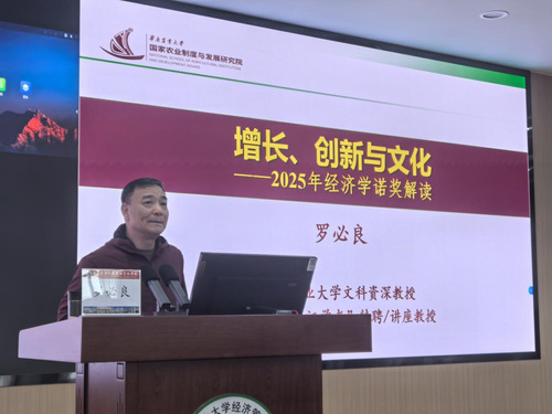 罗必良教授以2025年诺贝尔经济学奖的核心研究成果为切入点,结合经济学经典理论与现实发展案例,深入浅出地解析了经济增长的本质逻辑、创新驱动的内在机制,以及文化对长期经济发展的深层赋能作用。他既带领师生梳理了增长理论从“索洛模型黑箱”到“创造性破坏”的演进脉络,又聚焦历史维度探讨了文化认同与创新活力的关联,用严谨且不失风趣的表达,打破学术理论的壁垒,让师生们在鲜活案例中理解“增长、创新、文化”三者的共生关系,打开了观察经济发展规律的新视角。