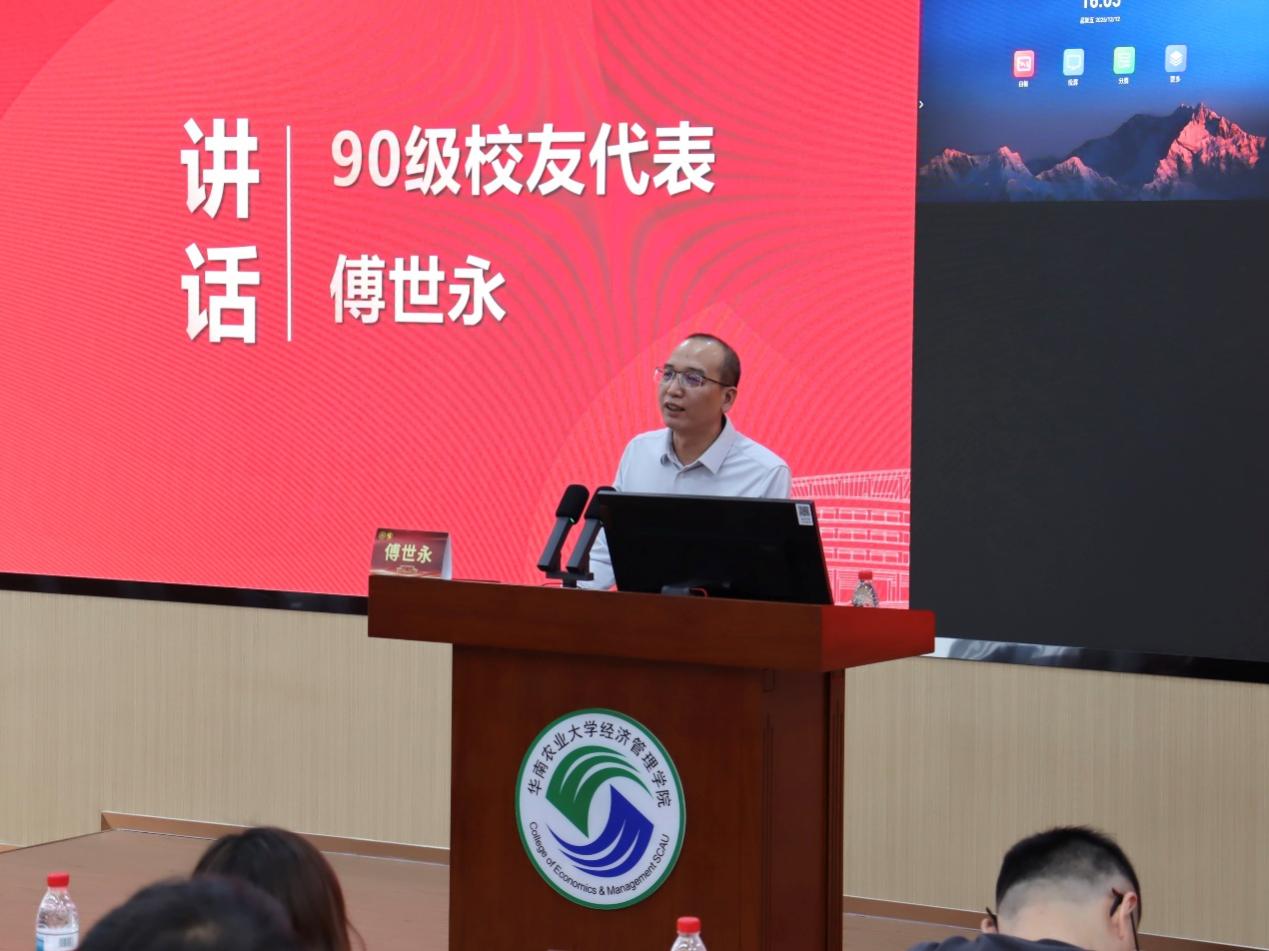 校友代表傅世永结合自身求学与创业经历,诠释了经管人“致知明德、经世济国”的使命传承,表达了对母校培养的感激之情及对在读学生的殷切期望。